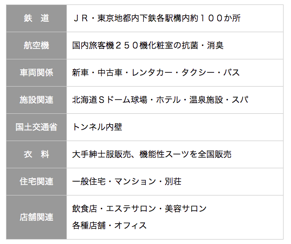 | 施工方法 | 塗装・散布 | 塗装・散布 | 塗装・散布 | 清掃・散布・発生器設置 | オゾン発生器を設置 | |