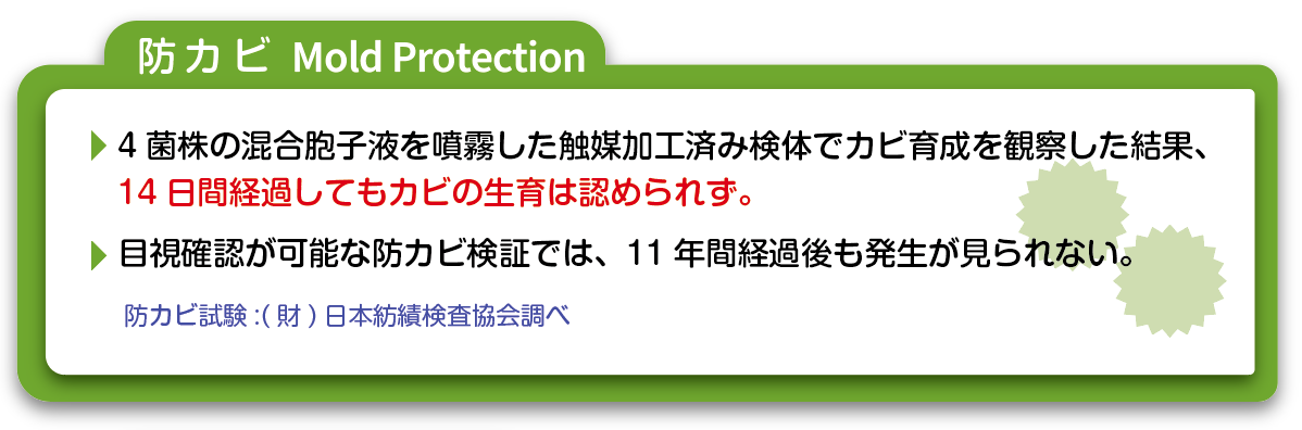 このような状況に対する最も有効な対策は、どのような条件下でも一定の防カビ機能を発揮する触媒を加工することです。