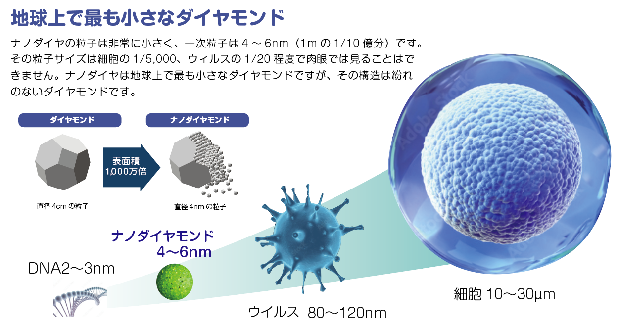 ナノダイヤモンドコートの主原料となる特殊なナノサイズのダイヤモンドは高圧力かつ酸素欠如雰囲気で特殊火薬を爆発させ製法された4~6ナノメートルのダイヤモンドで、化学的に安定している。