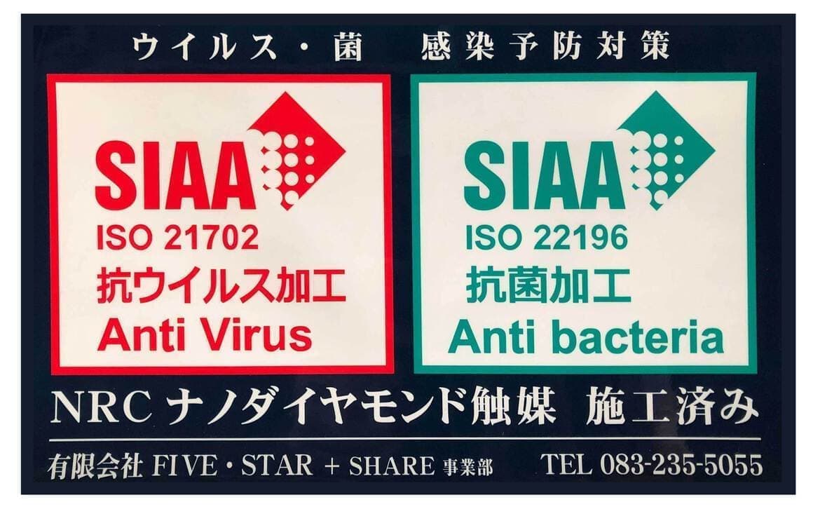 ナノダイヤ触媒は、旧通商産業省が公表した抗菌機能と安全性のガイドラインの内容を取り入れて制定された、「SIAA」(抗菌製品技術協議会)の認定商品です。