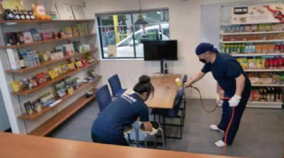 ご商談のお客様と従業員の安心・安全のためにしっかり全室、トイレ、デスク他を触媒致しました。